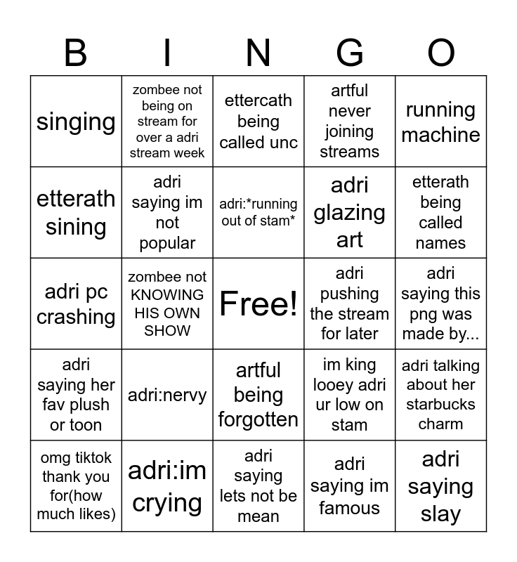 This bingo card has a free space and 24 words: adri:nervy, adri:im crying, adri:*running out of stam*, omg tiktok thank you for(how much likes), running machine, singing, etterath sining, zombee not being on stream for over a adri stream week, adri pushing the stream for later, artful being forgotten, adri glazing art, adri pc crashing, im king looey adri ur low on stam, adri talking about her starbucks charm, adri saying im not popular, adri saying im famous, adri saying this png was made by..., ettercath being called unc, etterath being called names, zombee not KNOWING HIS OWN SHOW, adri saying slay, adri saying her fav plush or toon, artful never joining streams and adri saying lets not be mean.