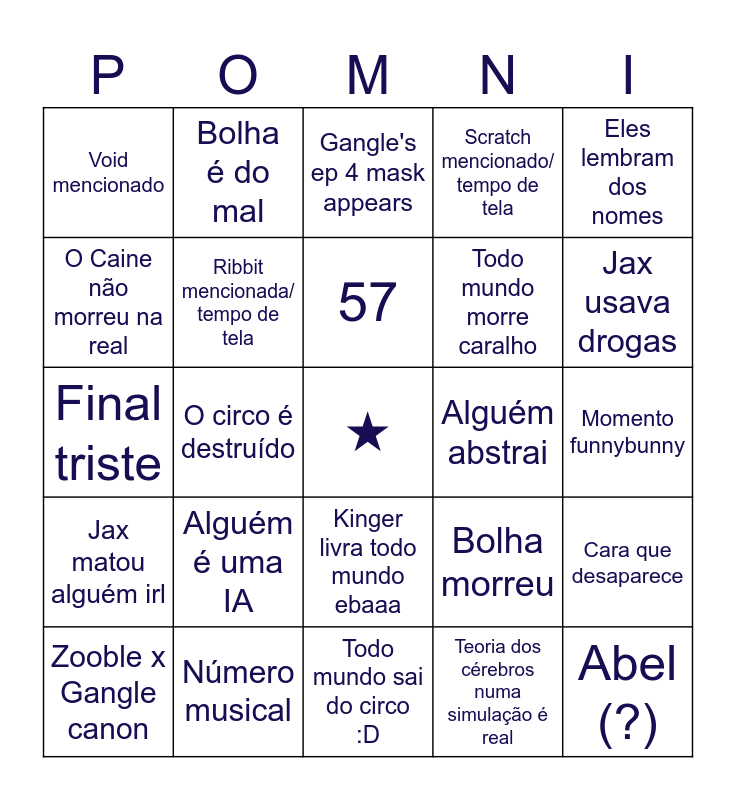 This bingo card has a free space and 24 words: Alguém é uma IA, Número musical, 57, Zooble x Gangle canon, Eles lembram dos nomes, Void mencionado, O Caine não morreu na real, Bolha é do mal, Alguém abstrai, Kinger livra todo mundo ebaaa, Todo mundo morre caralho, Final triste, Bolha morreu, Cara que desaparece, Ribbit mencionada/ tempo de tela, Teoria dos cérebros numa simulação é real, Momento funnybunny, Gangle's ep 4 mask appears, Jax usava drogas, O circo é destruído, Abel (?), Jax matou alguém irl, Scratch mencionado/ tempo de tela and Todo mundo sai do circo :D.