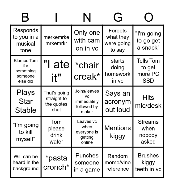 This bingo card has a free space and 24 words: Tom please drink water, *pasta cronch*, *chair creak*, Will can be heard in the background, "I'm going to go get a snack", Responds to you in a musical tone, Blames Tom for something someone else did, merkemrke mrkemrkr, Says an acronym out loud, Leaves vc when everyone is getting online, starts doing homework in vc, Plays Star Stable, Mentions kiggy, Streams when nobody asked, "I ate it", Random meme/vine reference, Hits mic/desk, Only one with cam on in vc, Tells Tom to get more PC SSD, That's going straight to the quotes chat, Brushes kiggy teeth in vc, "I'm going to kill myself", Forgets what they were going to say and Punches someone in a game.