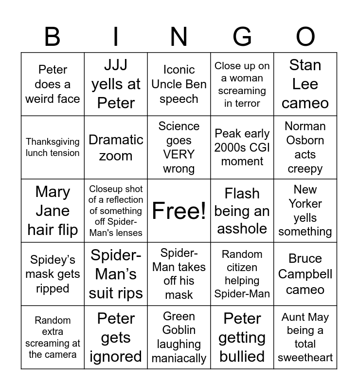 This bingo card has a free space and 24 words: Spider-Man’s suit rips, Peter gets ignored, Science goes VERY wrong, Random extra screaming at the camera, Stan Lee cameo, Peter does a weird face, Thanksgiving lunch tension, JJJ yells at Peter, Flash being an asshole, Spider-Man takes off his mask, Peak early 2000s CGI moment, Mary Jane hair flip, Random citizen helping Spider-Man, Bruce Campbell cameo, Dramatic zoom, Peter getting bullied, New Yorker yells something, Iconic Uncle Ben speech, Norman Osborn acts creepy, Closeup shot of a reflection of something off Spider-Man's lenses, Aunt May being a total sweetheart, Spidey’s mask gets ripped, Close up on a woman screaming in terror and Green Goblin laughing maniacally.