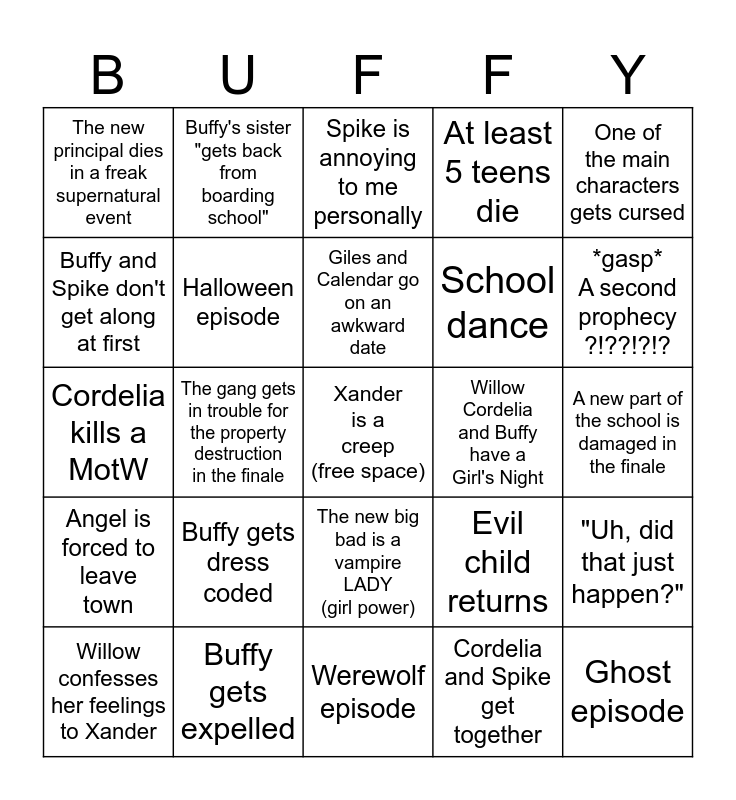 This bingo card has a free space and 24 words: Buffy gets dress coded, Buffy gets expelled, Giles and Calendar go on an awkward date, Willow confesses her feelings to Xander, One of the main characters gets cursed, The new principal dies in a freak supernatural event, Buffy and Spike don't get along at first, Buffy's sister "gets back from boarding school", Willow Cordelia and Buffy have a Girl's Night, The new big bad is a vampire LADY (girl power), School dance, Cordelia kills a MotW, Evil child returns, "Uh, did that just happen?", Halloween episode, Cordelia and Spike get together, A new part of the school is damaged in the finale, Spike is annoying to me personally, *gasp* A second prophecy ?!??!?!?, The gang gets in trouble for the property destruction in the finale, Ghost episode, Angel is forced to leave town, At least 5 teens die and Werewolf episode.