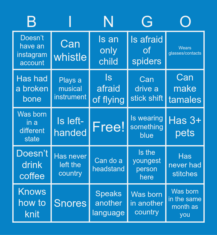 This bingo card has a free space and 31 words: Speaks another language, Has been to Honduras 2+ times, Is left-handed, Name begins with the same letter as yours, Doesn’t have an instagram account, Is an only child, Plays a musical instrument, Is the youngest person here, Is wearing something blue, Was born in another country, Has 3+ pets, Was born in the same month as you, Has 2+ tattoos, Is/was a teacher, Can make tamales, Was born in the same month as you, Has never had stitches, Has never left the country, Doesn’t drink coffee, Can do a headstand, Wears glasses/contacts, Likes sushi, Knows how to knit, Can whistle, Can drive a stick shift, Has had a broken bone, Is afraid of spiders, Was born in a different state, Snores, Is afraid of flying and Has the same color eyes as you.