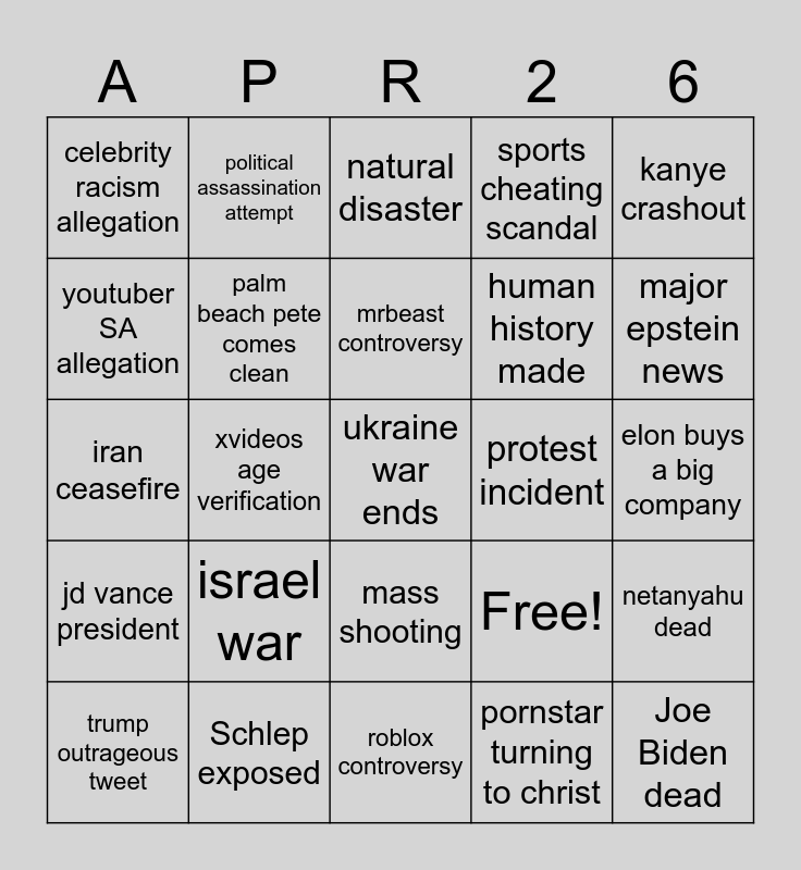 This bingo card has 25 words: israel war, roblox controversy, mrbeast controversy, trump outrageous tweet, kanye crashout, celebrity racism allegation, youtuber SA allegation, political assassination attempt, protest incident, mass shooting, human history made, iran ceasefire, Free!, netanyahu dead, palm beach pete comes clean, Joe Biden dead, elon buys a big company, natural disaster, major epstein news, xvideos age verification, ukraine war ends, Schlep exposed, jd vance president, sports cheating scandal and pornstar turning to christ.