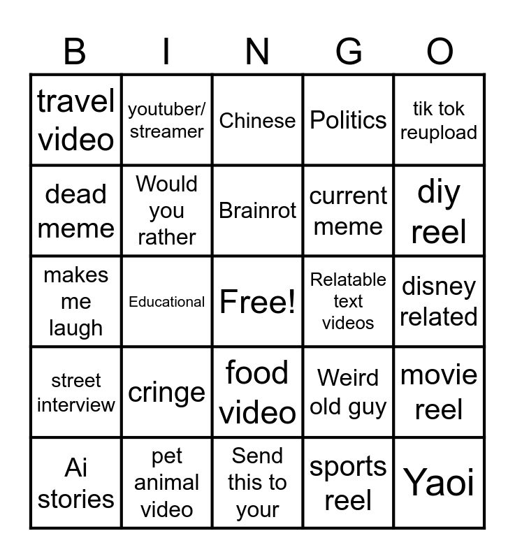 This bingo card has a free space and 24 words: cringe, pet animal video, Brainrot, Ai stories, tik tok reupload, travel video, dead meme, youtuber/ streamer, Relatable text videos, food video, current meme, makes me laugh, Weird old guy, movie reel, Would you rather, sports reel, disney related, Chinese, diy reel, Educational, Yaoi, street interview, Politics and Send this to your.