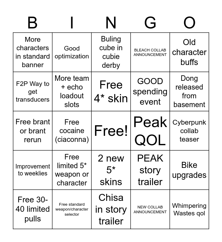 This bingo card has a free space and 24 words: Free limited 5* weapon or character, Free standard weapon/character selector, Free 4* skin, Free 30-40 limited pulls, Old character buffs, More characters in standard banner, F2P Way to get transducers, Good optimization, Peak QOL, 2 new 5* skins, GOOD spending event, Free brant or brant rerun, PEAK story trailer, Bike upgrades, More team + echo loadout slots, NEW COLLAB ANNOUNCEMENT, Cyberpunk collab teaser, Buling cube in cubie derby, Dong released from basement, Free cocaine (ciaconna), Whimpering Wastes qol, Improvement to weeklies, BLEACH COLLAB ANNOUNCEMENT and Chisa in story trailer.