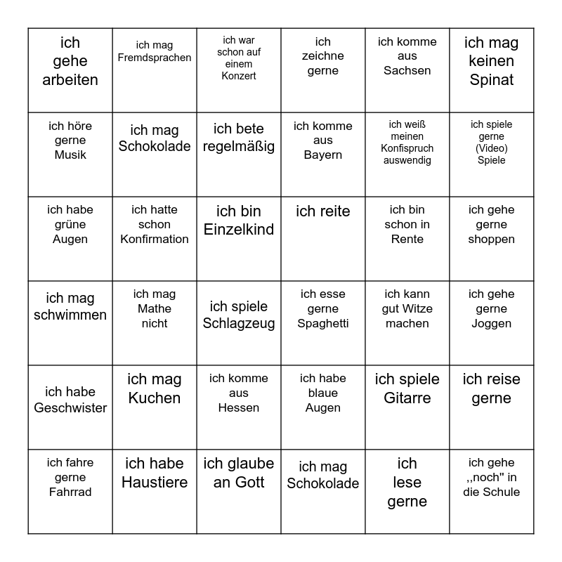 This bingo card has 36 words: ich habe blaue Augen, ich komme aus Hessen, ich mag Schokolade, ich höre gerne Musik, ich mag schwimmen, ich reite, ich mag Schokolade, ich glaube an Gott, ich komme aus Sachsen, ich spiele Gitarre, ich spiele gerne (Video) Spiele, ich zeichne gerne, ich reise gerne, ich hatte schon Konfirmation, ich komme aus Bayern, ich gehe arbeiten, ich habe Geschwister, ich bin schon in Rente, ich habe grüne Augen, ich war schon auf einem Konzert, ich bin Einzelkind, ich mag Mathe nicht, ich esse gerne Spaghetti, ich spiele Schlagzeug, ich kann gut Witze machen, ich mag Fremdsprachen, ich weiß meinen Konfispruch auswendig, ich habe Haustiere, ich bete regelmäßig, ich mag keinen Spinat, ich gehe ,,noch'' in die Schule, ich fahre gerne Fahrrad, ich gehe gerne Joggen, ich gehe gerne shoppen, ich mag Kuchen and ich lese gerne.