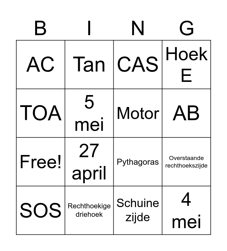 This bingo card has 20 words: Overstaande rechthoekszijde, 5, CAS, Tan, SOS, TOA, Rechthoekige driehoek, AC, Free!, Tan, 27 april, Pythagoras, 5 mei, 4 mei, Motor, Fiets, AB, Hoek E, Schuine zijde and Rechthoekige driehoek.