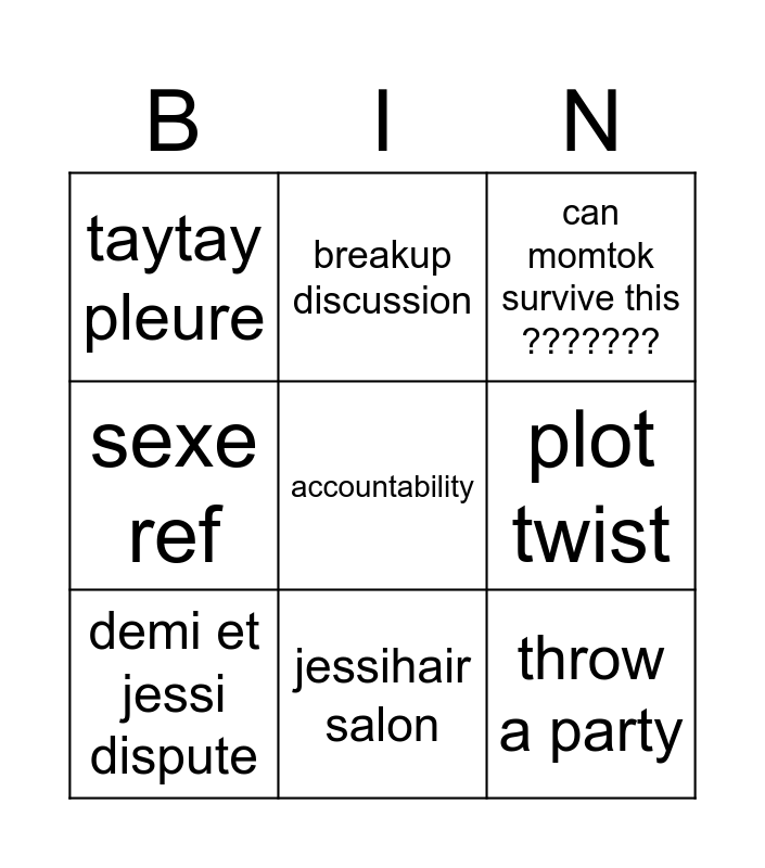 This bingo card has a free space and 8 words: plot twist, can momtok survive this ???????, breakup discussion, demi et jessi dispute, taytay pleure, throw a party, sexe ref and jessihair salon.