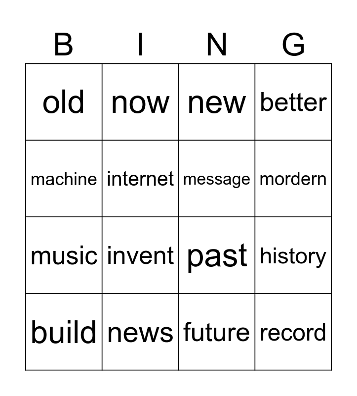 This bingo card has 22 words: news, then, now, computer, internet, message, old, new, past, record, music, better, easier, present, future, communicate, history, build, invent, machine, mordern and tool.