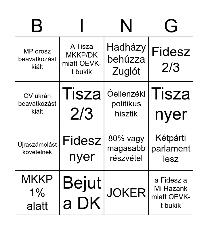 This bingo card has 16 words: Bejut a DK, Kétpárti parlament lesz, Hadházy behúzza Zuglót, MP orosz beavatkozást kiált, Újraszámolást követelnek, A Tisza MKKP/DK miatt OEVK-t bukik, 80% vagy magasabb részvétel, JOKER, OV ukrán beavatkozást kiált, Tisza 2/3, MKKP 1% alatt, Fidesz 2/3, Fidesz nyer, Tisza nyer, Óellenzéki politikus hisztik and a Fidesz a Mi Hazánk miatt OEVK-t bukik.