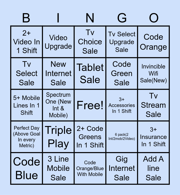 This bingo card has a free space and 24 words: Triple Play, 3 Line Mobile Sale, Tablet Sale, Code Blue, Code Orange, 2+ Video In 1 Shift, Tv Select Sale, Video Upgrade, 3+ Accessories In 1 Shift, 2+ Code Greens In 1 Shift, Code Green Sale, 5+ Mobile Lines In 1 Shift, 6 pack(2 Int/2mob/2Video), 3+ Insurance In 1 Shift, New Internet Sale, Gig Internet Sale, Tv Stream Sale, Tv Choice Sale, Invincible Wifi Sale(New), Spectrum One (New Int & Mobile), Add A line Sale, Perfect Day (Above Goal In every Metric), Tv Select Upgrade Sale and Code Orange/Blue With Mobile.