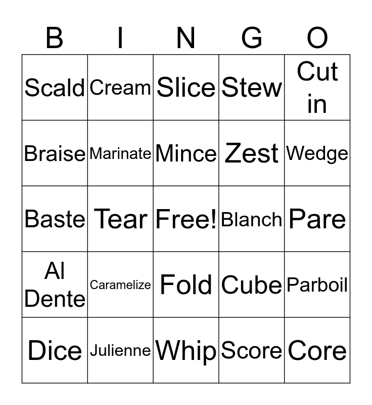 This bingo card has a free space and 24 words: Caramelize, Julienne, Mince, Dice, Cut in, Scald, Braise, Cream, Blanch, Fold, Zest, Baste, Cube, Parboil, Marinate, Score, Pare, Slice, Wedge, Tear, Core, Al Dente, Stew and Whip.