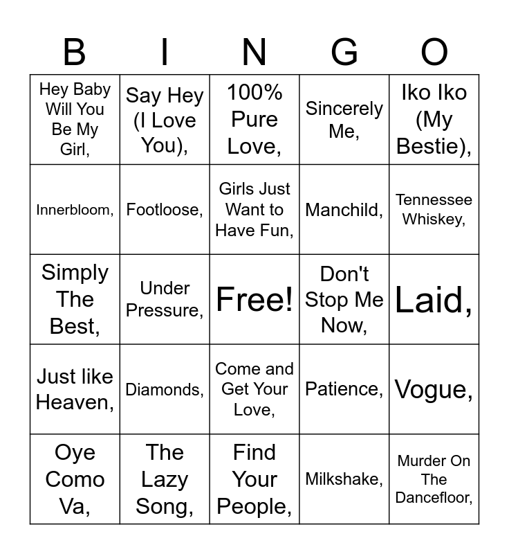 This bingo card has a free space and 39 words: Touch of Grey,, Sweet Child O' Mine,, Shivers,, Footloose,, Oye Como Va,, Come and Get Your Love,, Girls Just Want to Have Fun,, Baby Got Back,, Iko Iko (My Bestie),, Just like Heaven,, Under Pressure,, Sincerely Me,, Murder On The Dancefloor,, Laid,, Don't Stop Me Now,, Diamonds,, Flowers,, Hey Baby Will You Be My Girl,, Like a Prayer,, Patience,, Innerbloom,, Find Your People,, Manchild,, Tennessee Whiskey,, The Safety Dance,, Scarlet Begonias,, Hypnotize,, Queen Of Hearts,, Shut Up and Dance,, Say Hey (I Love You),, I Wanna Dance with Somebody,, You Gotta Be,, 100% Pure Love,, The Lazy Song,, Milkshake,, You Oughta Know,, Vogue,, Simply The Best, and Criminals.
