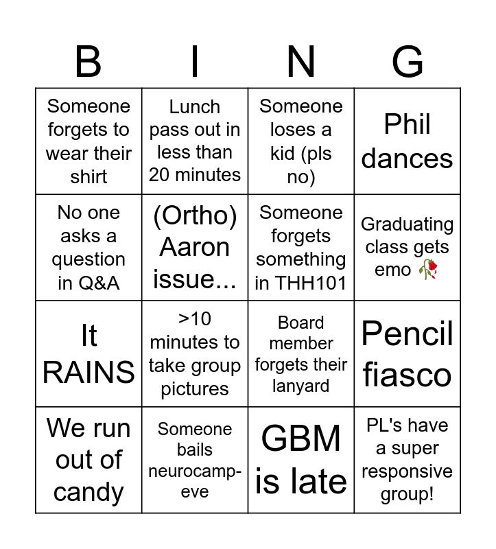 This bingo card has 16 words: Someone bails neurocamp-eve, Pencil fiasco, Someone loses a kid (pls no), Someone forgets to wear their shirt, It RAINS, Lunch pass out in less than 20 minutes, Board member forgets their lanyard, GBM is late, No one asks a question in Q&A, (Ortho) Aaron issue..., We run out of candy, Phil dances, >10 minutes to take group pictures, Graduating class gets emo 🥀, Someone forgets something in THH101 and PL's have a super responsive group!.