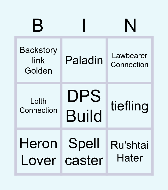 This bingo card has a free space and 8 words: tiefling, Lawbearer Connection, Paladin, Heron Lover, Backstory link Golden, Ru'shtai Hater, Lolth Connection and Spell caster.