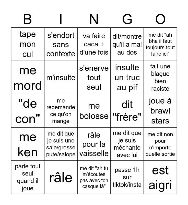This bingo card has a free space and 24 words: me dit que je suis une sale/grosse pute/salope, râle, s'enerve tout seul, parle tout seul quand il joue, me dit "ah bha il faut toujours tout faire ici", tape mon cul, me mord, s'endort sans contexte, dit "frère", râle pour la vaisselle, insulte un truc au pif, "de con", me dit que je suis méchante avec lui, me dit non pour n'importe quelle sortie, m'insulte, passe 1h sur tiktok/insta, joue à brawl stars, va faire caca + d'une fois, fait une blague bien raciste, me redemande ce qu'on mange, est aigri, me ken, dit/montre qu'il a mal au dos and me dit "ah tu m'écoutes pas avec ton casque là".