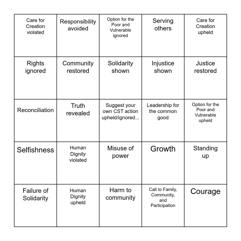 This bingo card has a free space and 24 words: Human Dignity violated, Human Dignity upheld, Solidarity shown, Failure of Solidarity, Care for Creation upheld, Care for Creation violated, Rights ignored, Responsibility avoided, Leadership for the common good, Misuse of power, Injustice shown, Reconciliation, Growth, Standing up, Community restored, Call to Family, Community, and Participation, Option for the Poor and Vulnerable upheld, Option for the Poor and Vulnerable ignored, Justice restored, Truth revealed, Courage, Selfishness, Serving others and Harm to community.