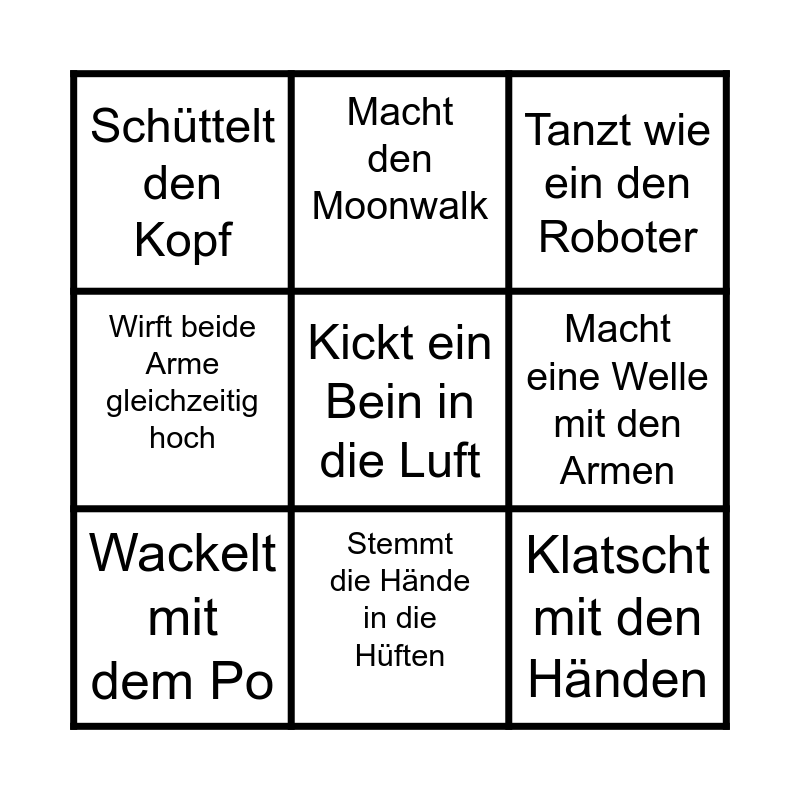 This bingo card has 9 words: Wackelt mit dem Po, Kickt ein Bein in die Luft, Tanzt wie ein den Roboter, Schüttelt den Kopf, Macht den Moonwalk, Macht eine Welle mit den Armen, Wirft beide Arme gleichzeitig hoch, Stemmt die Hände in die Hüften and Klatscht mit den Händen.