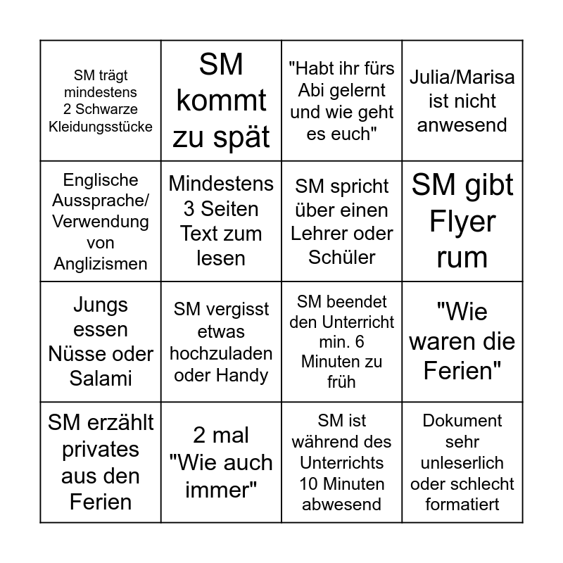 This bingo card has 16 words: 2 mal "Wie auch immer", "Wie waren die Ferien", "Habt ihr fürs Abi gelernt und wie geht es euch", SM trägt mindestens 2 Schwarze Kleidungsstücke, Jungs essen Nüsse oder Salami, SM kommt zu spät, SM beendet den Unterricht min. 6 Minuten zu früh, SM ist während des Unterrichts 10 Minuten abwesend, Englische Aussprache/ Verwendung von Anglizismen, Mindestens 3 Seiten Text zum lesen, SM erzählt privates aus den Ferien, Julia/Marisa ist nicht anwesend, SM vergisst etwas hochzuladen oder Handy, SM gibt Flyer rum, SM spricht über einen Lehrer oder Schüler and Dokument sehr unleserlich oder schlecht formatiert.