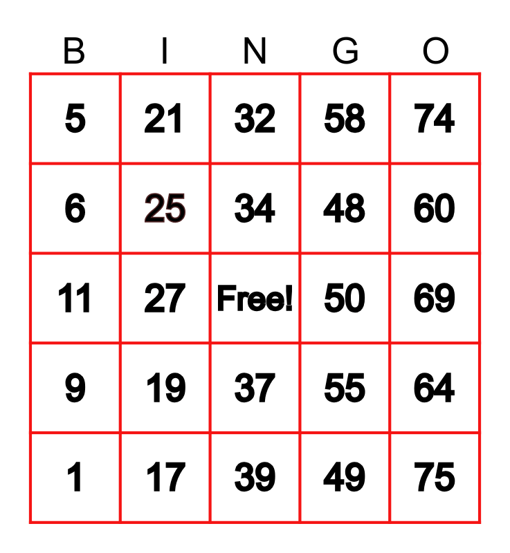 This bingo card has a free space and 24 words: 1, 19, 34, 49, 74, 5, 21, 32, 50, 69, 11, 25, 55, 64, 6, 17, 39, 58, 60, 9, 27, 37, 48 and 75.