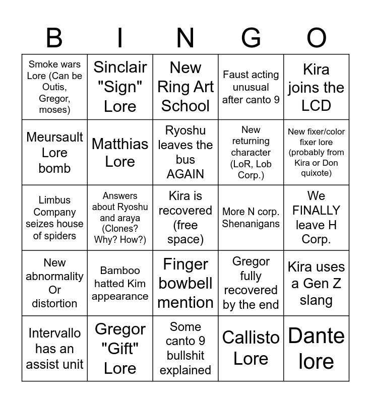 This bingo card has a free space and 24 words: Bamboo hatted Kim appearance, Gregor "Gift" Lore, Ryoshu leaves the bus AGAIN, Intervallo has an assist unit, Kira joins the LCD, Smoke wars Lore (Can be Outis, Gregor, moses), Meursault Lore bomb, Sinclair "Sign" Lore, More N corp. Shenanigans, Finger bowbell mention, New returning character (LoR, Lob Corp.), Limbus Company seizes house of spiders, Gregor fully recovered by the end, Kira uses a Gen Z slang, Matthias Lore, Callisto Lore, We FINALLY leave H Corp., New Ring Art School, New fixer/color fixer lore (probably from Kira or Don quixote), Answers about Ryoshu and araya (Clones? Why? How?), Dante lore, New abnormality Or distortion, Faust acting unusual after canto 9 and Some canto 9 bullshit explained.