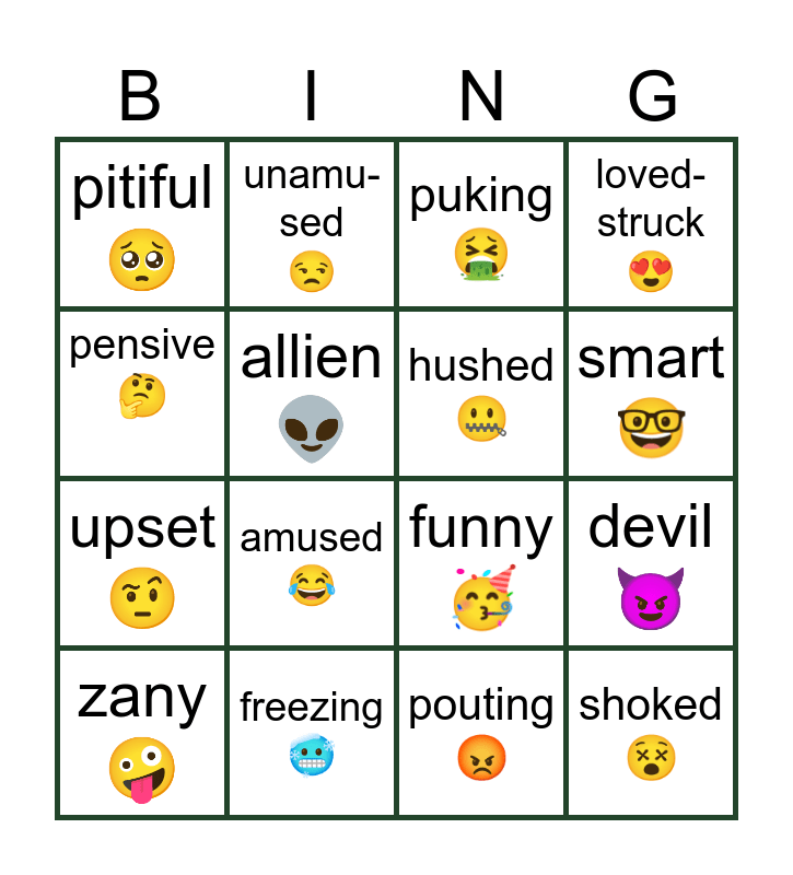 This bingo card has 1 images and 40 words: dizzy, funny ๐ฅณ, playful ๐, hushed ๐ค, sad ๐ข, liar ๐คฅ, smart ๐ค, furious ๐ค, pensive ๐ค, shoked ๐ต, devil ๐, loved- struck ๐, zany ๐คช, pouting ๐ก, freezing ๐ฅถ, excited ๐คฉ, happy ๐, pitiful ๐ฅบ, relaxed ๐, puking ๐คฎ, sleepy ๐ด, ill ๐ท, upset ๐คจ, allien ๐ฝ, aston-ished ๐ฑ, mind blown ๐คฏ, good ๐, sneezing ๐คง, hot ๐ฐ, relieved ๐, fearful ๐จ, angry ๐ , tired ๐ช, hungry ๐, amused ๐, worried ๐, mischie- vous ๐, surprised ๐ฏ, unamu- sed ๐ and embarra- sed ๐ฅน.