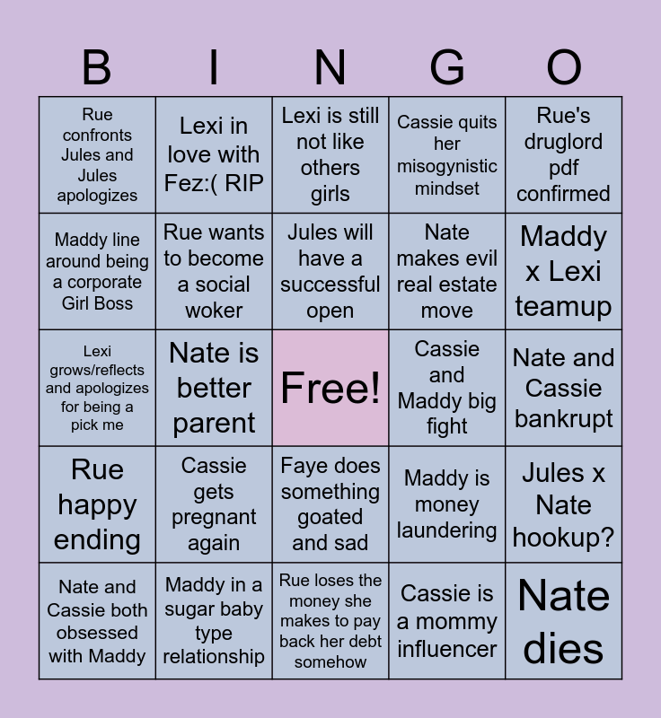 This bingo card has a free space and 24 words: Cassie gets pregnant again, Maddy in a sugar baby type relationship, Jules will have a successful open, Nate and Cassie both obsessed with Maddy, Rue's druglord pdf confirmed, Rue confronts Jules and Jules apologizes, Maddy line around being a corporate Girl Boss, Lexi in love with Fez:( RIP, Cassie and Maddy big fight, Faye does something goated and sad, Nate makes evil real estate move, Lexi grows/reflects and apologizes for being a pick me, Maddy is money laundering, Jules x Nate hookup?, Rue wants to become a social woker, Cassie is a mommy influencer, Nate and Cassie bankrupt, Lexi is still not like others girls, Maddy x Lexi teamup, Nate is better parent, Nate dies, Rue happy ending, Cassie quits her misogynistic mindset and Rue loses the money she makes to pay back her debt somehow.