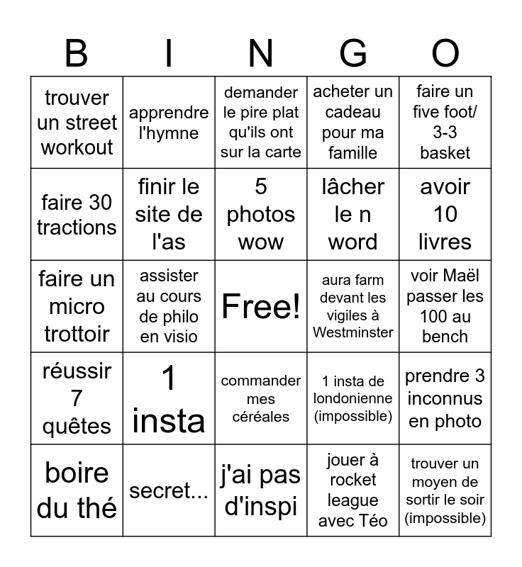 This bingo card has a free space and 24 words: 1 insta, secret..., 5 photos wow, boire du thé, faire un five foot/ 3-3 basket, trouver un street workout, faire 30 tractions, apprendre l'hymne, aura farm devant les vigiles à Westminster, commander mes céréales, lâcher le n word, faire un micro trottoir, 1 insta de londonienne (impossible), prendre 3 inconnus en photo, finir le site de l'as, jouer à rocket league avec Téo, voir Maël passer les 100 au bench, demander le pire plat qu'ils ont sur la carte, avoir 10 livres, assister au cours de philo en visio, trouver un moyen de sortir le soir (impossible), réussir 7 quêtes, acheter un cadeau pour ma famille and j'ai pas d'inspi.