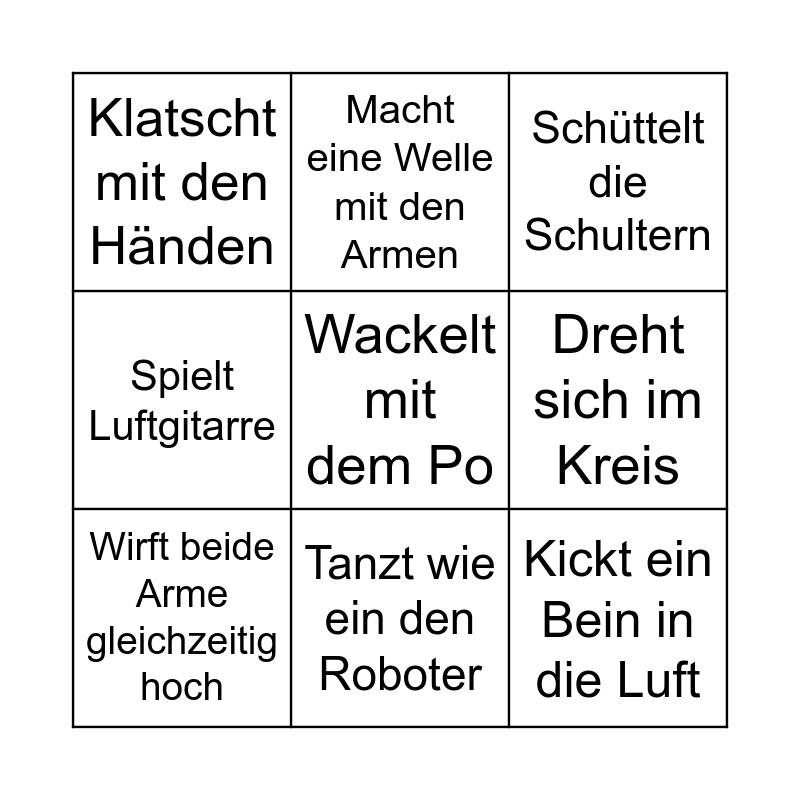 This bingo card has 9 words: Wirft beide Arme gleichzeitig hoch, Schüttelt die Schultern, Macht eine Welle mit den Armen, Spielt Luftgitarre, Klatscht mit den Händen, Dreht sich im Kreis, Wackelt mit dem Po, Kickt ein Bein in die Luft and Tanzt wie ein den Roboter.