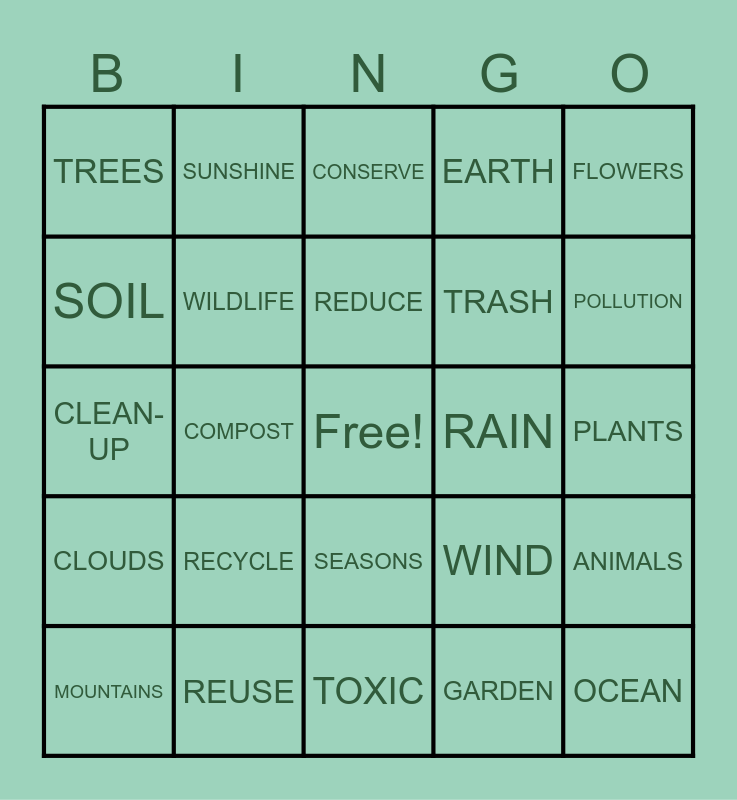 This bingo card has a free space and 24 words: RECYCLE, REUSE, REDUCE, MOUNTAINS, FLOWERS, TREES, SOIL, SUNSHINE, RAIN, SEASONS, TRASH, CLEAN-UP, WIND, ANIMALS, WILDLIFE, GARDEN, PLANTS, CONSERVE, POLLUTION, COMPOST, OCEAN, CLOUDS, EARTH and TOXIC.