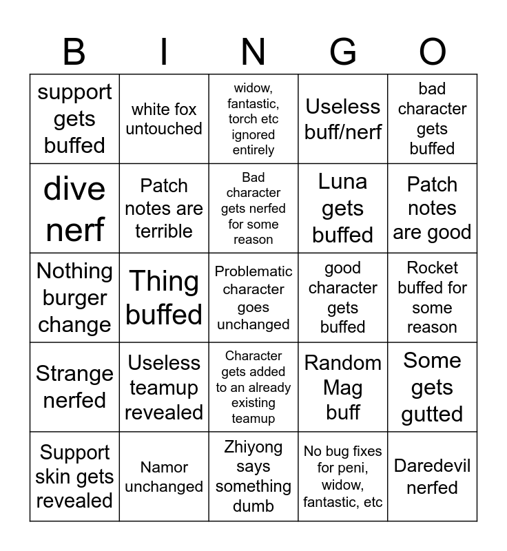 This bingo card has a free space and 24 words: Useless teamup revealed, Namor unchanged, Bad character gets nerfed for some reason, Support skin gets revealed, bad character gets buffed, support gets buffed, dive nerf, white fox untouched, good character gets buffed, Character gets added to an already existing teamup, Luna gets buffed, Nothing burger change, Random Mag buff, Some gets gutted, Patch notes are terrible, No bug fixes for peni, widow, fantastic, etc, Rocket buffed for some reason, widow, fantastic, torch etc ignored entirely, Patch notes are good, Thing buffed, Daredevil nerfed, Strange nerfed, Useless buff/nerf and Zhiyong says something dumb.