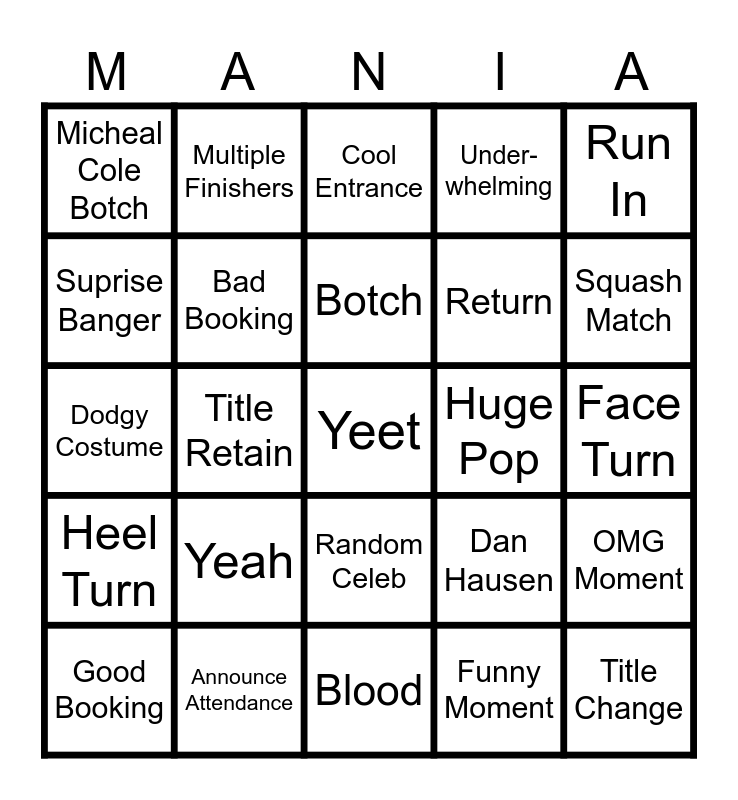 This bingo card has a free space and 24 words: Yeah, Announce Attendance, Botch, Good Booking, Run In, Micheal Cole Botch, Suprise Banger, Multiple Finishers, Huge Pop, Random Celeb, Return, Dodgy Costume, Dan Hausen, OMG Moment, Bad Booking, Funny Moment, Face Turn, Cool Entrance, Squash Match, Title Retain, Title Change, Heel Turn, Under-whelming and Blood.