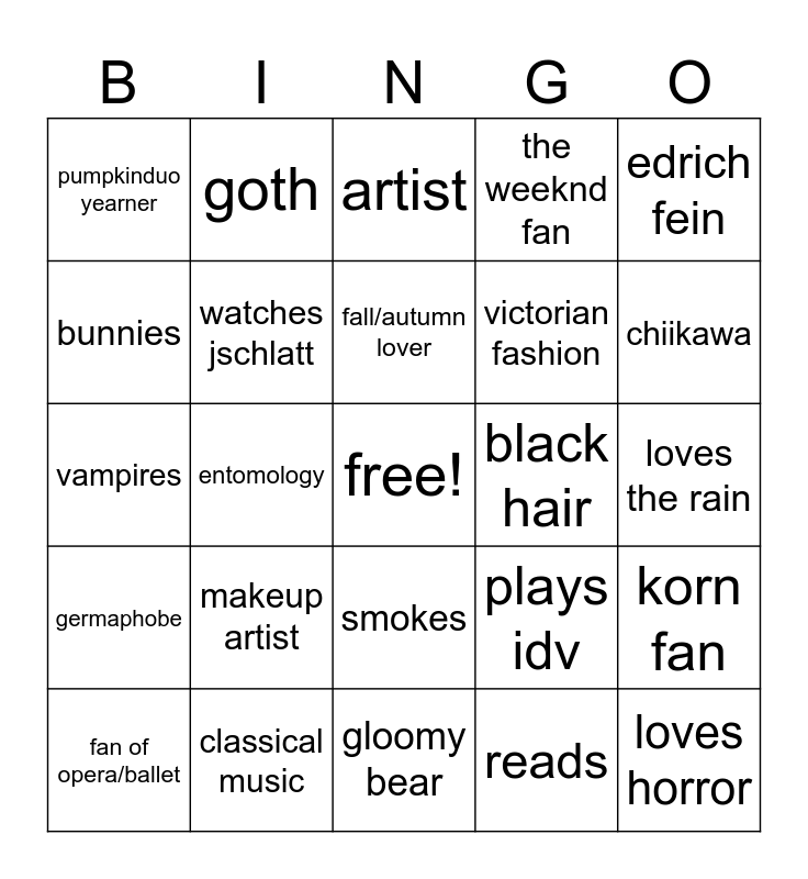 This bingo card has a free space and 24 words: makeup artist, classical music, fall/autumn lover, fan of opera/ballet, edrich fein, pumpkinduo yearner, bunnies, goth, black hair, smokes, victorian fashion, vampires, plays idv, korn fan, watches jschlatt, reads, loves the rain, artist, chiikawa, entomology, loves horror, germaphobe, the weeknd fan and gloomy bear.