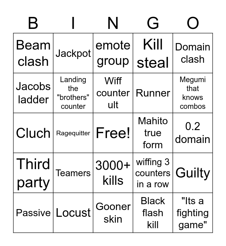 This bingo card has a free space and 24 words: Teamers, Locust, Wiff counter ult, Passive, Domain clash, Beam clash, Jacobs ladder, Jackpot, Mahito true form, 3000+ kills, Runner, Cluch, wiffing 3 counters in a row, Guilty, Landing the "brothers" counter, Black flash kill, 0.2 domain, emote group, Megumi that knows combos, Ragequitter, "Its a fighting game", Third party, Kill steal and Gooner skin.