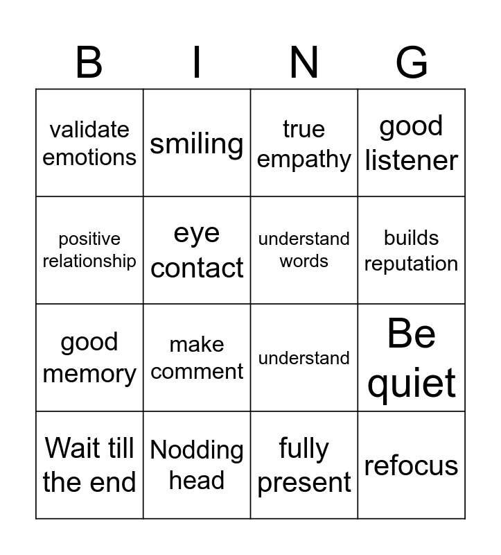 This bingo card has 22 words: Nodding head, leaning in, smiling, encouraging, eye contact, understand words, validate emotions, true empathy, understand, refocus, good memory, good listener, ask clarification, pay attention, fully present, distracted, Be quiet, Wait till the end, make comment, positive relationship, builds reputation and be respected.