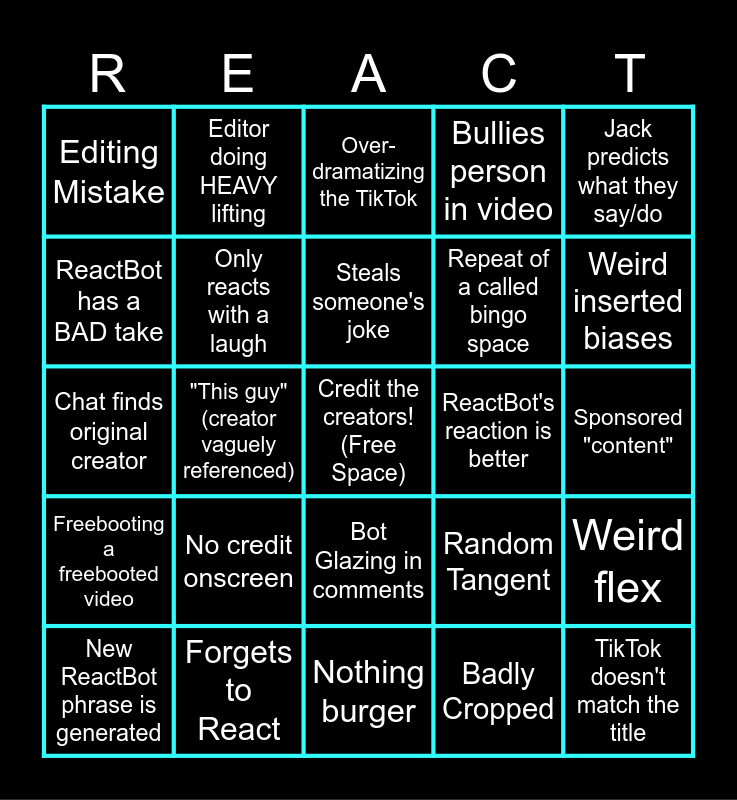 This bingo card has a free space and 24 words: No credit onscreen, Forgets to React, Steals someone's joke, New ReactBot phrase is generated, Jack predicts what they say/do, Editing Mistake, ReactBot has a BAD take, Editor doing HEAVY lifting, ReactBot's reaction is better, Bot Glazing in comments, Repeat of a called bingo space, Chat finds original creator, Random Tangent, Weird flex, Only reacts with a laugh, Badly Cropped, Sponsored "content", Over-dramatizing the TikTok, Weird inserted biases, "This guy" (creator vaguely referenced), TikTok doesn't match the title, Freebooting a freebooted video, Bullies person in video and Nothing burger.