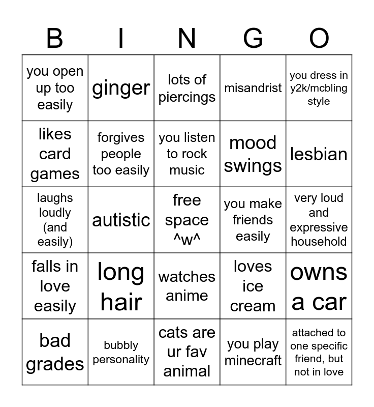 This bingo card has a free space and 24 words: long hair, bubbly personality, you listen to rock music, bad grades, you dress in y2k/mcbling style, you open up too easily, likes card games, ginger, you make friends easily, watches anime, mood swings, laughs loudly (and easily), loves ice cream, owns a car, forgives people too easily, you play minecraft, very loud and expressive household, lots of piercings, lesbian, autistic, attached to one specific friend, but not in love, falls in love easily, misandrist and cats are ur fav animal.