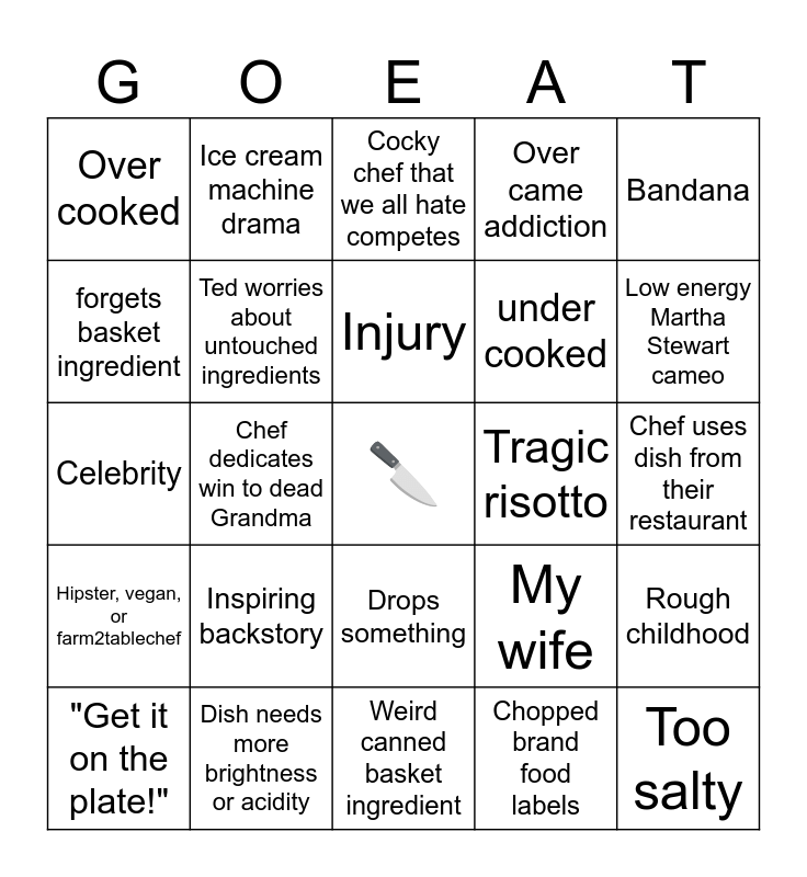 This bingo card has a free space and 24 words: Inspiring backstory, Dish needs more brightness or acidity, Injury, "Get it on the plate!", Bandana, Over cooked, forgets basket ingredient, Ice cream machine drama, Tragic risotto, Drops something, under cooked, Celebrity, My wife, Rough childhood, Ted worries about untouched ingredients, Chopped brand food labels, Chef uses dish from their restaurant, Cocky chef that we all hate competes, Low energy Martha Stewart cameo, Chef dedicates win to dead Grandma, Too salty, Hipster, vegan, or farm2tablechef, Over came addiction and Weird canned basket ingredient.