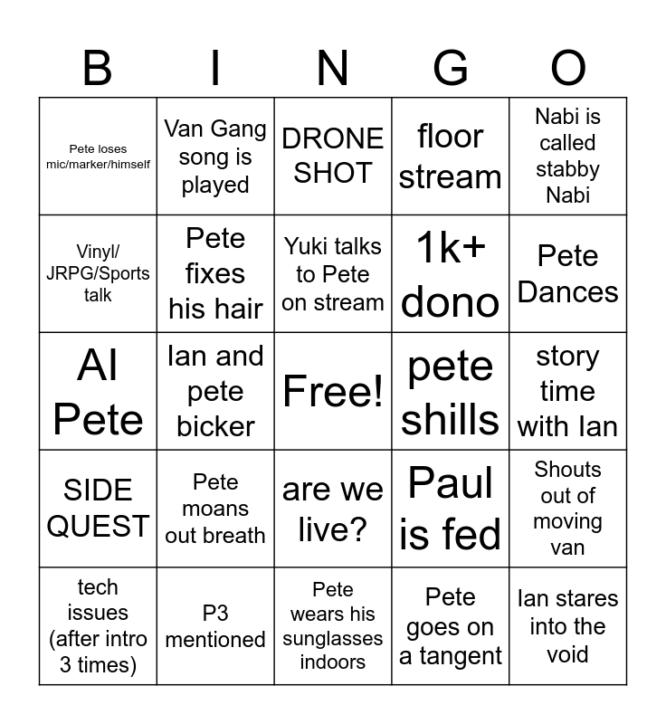 This bingo card has a free space and 24 words: Pete moans out breath, P3 mentioned, Yuki talks to Pete on stream, tech issues (after intro 3 times), Nabi is called stabby Nabi, Pete loses mic/marker/himself, Vinyl/ JRPG/Sports talk, Van Gang song is played, pete shills, are we live?, 1k+ dono, AI Pete, Paul is fed, Shouts out of moving van, Pete fixes his hair, Pete goes on a tangent, story time with Ian, DRONE SHOT, Pete Dances, Ian and pete bicker, Ian stares into the void, SIDE QUEST, floor stream and Pete wears his sunglasses indoors.