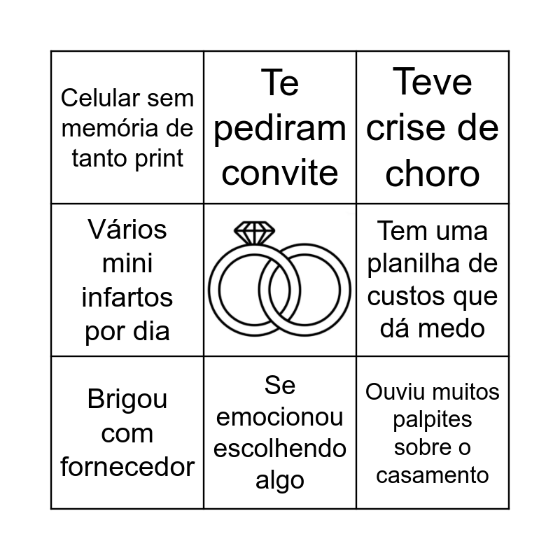 This bingo card has a free space and 11 words: Provou mais de 10 vestidos, Se emocionou escolhendo algo, Ouviu muitos palpites sobre o casamento, Brigou com fornecedor, Te pediram convite, Teve crise de choro, Tem uma planilha de custos que dá medo, Teve crise de ansiedade, Vários mini infartos por dia, Celular sem memória de tanto print and Criou 50 pastas inspiração no Pinterest.
