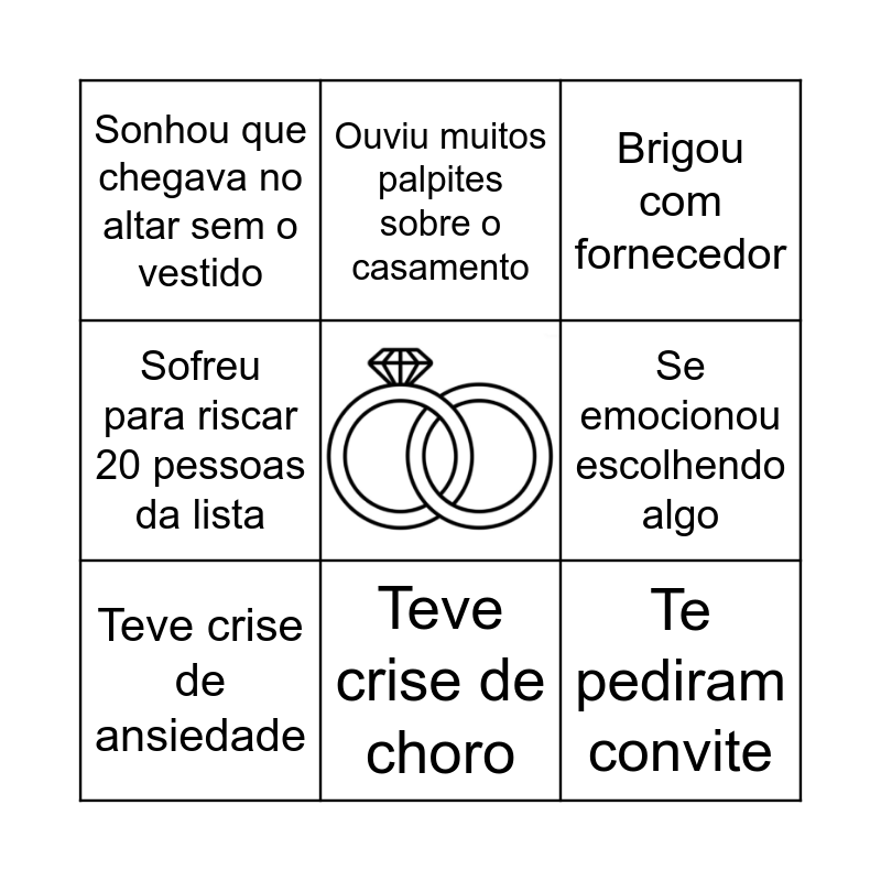 This bingo card has a free space and 11 words: Provou mais de 10 vestidos, Teve crise de choro, Te pediram convite, Teve crise de ansiedade, Ouviu muitos palpites sobre o casamento, Brigou com fornecedor, Se emocionou escolhendo algo, Tem uma planilha de custos que dá medo, Sofreu para riscar 20 pessoas da lista, Sonhou que chegava no altar sem o vestido and Ainda não sabe o que vai calçar.