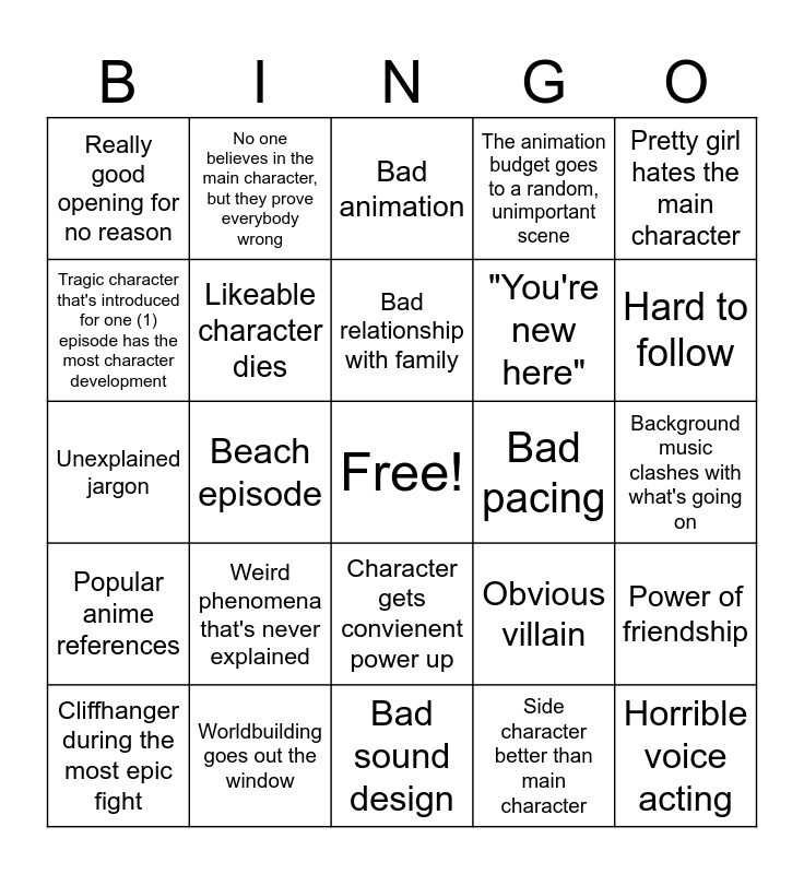 This bingo card has a free space and 34 words: Shouting ability and/or technique names, Side character better than main character, Main character has broken abilities, Low budget facial animations, Popular anime references, Likeable character dies, Pretty girl hates the main character, Cliffhanger during the most epic fight, No one believes in the main character, but they prove everybody wrong, Cringy name shouting, Bad relationship with family, Bad animation, Motorbikes, Violence without injury, Bad pacing, Hard to follow, Worldbuilding goes out the window, Unexplained jargon, Weird phenomena that's never explained, Obvious villain, Character gets convienent power up, Interesting side plot that goes nowhere, Really good opening for no reason, Background music clashes with what's going on, Bad sound design, Horrible voice acting, The animation budget goes to a random, unimportant scene, Action delivered without set up, "You're new here", Tragic character that's introduced for one (1) episode has the most character development, Lolis, Beach episode, Power of friendship and Jarring CGI.