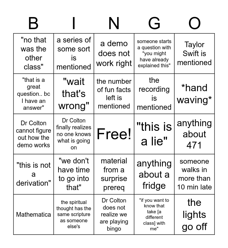 This bingo card has a free space and 29 words: Mathematica, pickleball is mentioned, Dr Colton finally realizes no one knows what is going on, someone is wearing the physics shirt, "no that was the other class", a demo does not work right, "wait that's wrong", "we don't have time to go into that", "this is a lie", the spiritual thought has the same scripture as someone else's, anything about 471, the lights go off, Dr Colton does not realize we are playing bingo, "if you want to know that take [a different class] with me", *hand waving*, the time taken for a test is grossly underestimated, material from a surprise prereq, "this is not a derivation", Taylor Swift is mentioned, Dr Colton cannot figure out how the demo works, anything about a fridge, Siri is set off, the recording is mentioned, "that is a great question.. bc I have an answer", someone starts a question with "you might have already explained this", a series of some sort is mentioned, someone walks in more than 10 min late, the number of fun facts left is mentioned and it was a derivation this time.