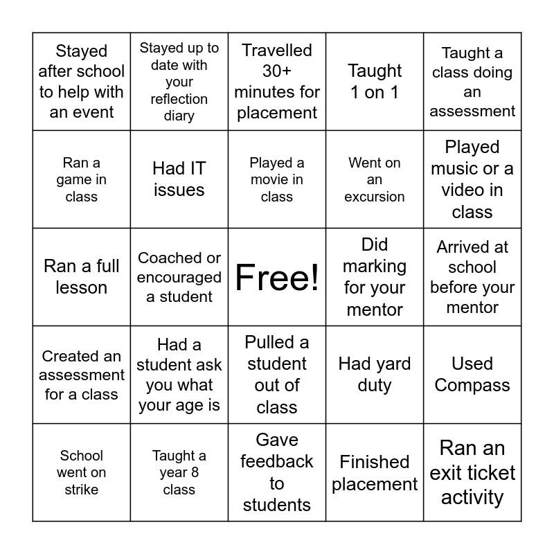 This bingo card has a free space and 24 words: Had a student ask you what your age is, Taught a year 8 class, Played a movie in class, School went on strike, Taught a class doing an assessment, Stayed after school to help with an event, Ran a game in class, Stayed up to date with your reflection diary, Did marking for your mentor, Pulled a student out of class, Went on an excursion, Ran a full lesson, Had yard duty, Used Compass, Had IT issues, Finished placement, Arrived at school before your mentor, Travelled 30+ minutes for placement, Played music or a video in class, Coached or encouraged a student, Ran an exit ticket activity, Created an assessment for a class, Taught 1 on 1 and Gave feedback to students.
