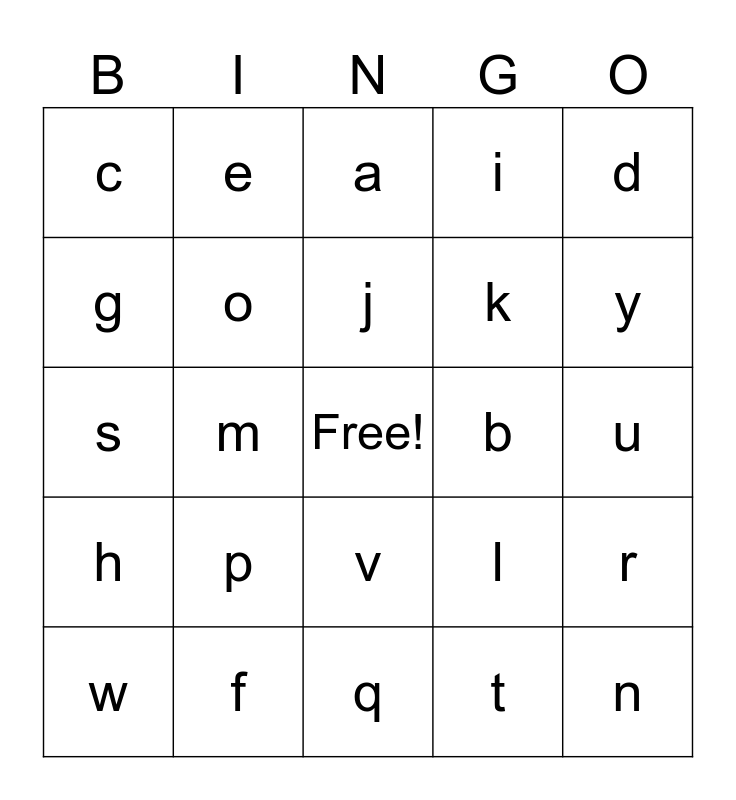 This bingo card has a free space and 24 words: p, f, j, w, d, c, g, e, b, v, k, s, l, r, o, t, u, a, y, m, n, h, i and q.