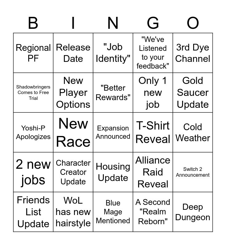 This bingo card has a free space and 24 words: Character Creator Update, WoL has new hairstyle, "Better Rewards", Friends List Update, 3rd Dye Channel, Regional PF, Shadowbringers Comes to Free Trial, Release Date, T-Shirt Reveal, Housing Update, Only 1 new job, Yoshi-P Apologizes, Alliance Raid Reveal, Switch 2 Announcement, New Player Options, A Second "Realm Reborn", Cold Weather, "Job Identity", Gold Saucer Update, New Race, Deep Dungeon, 2 new jobs, "We've Listened to your feedback" and Blue Mage Mentioned.