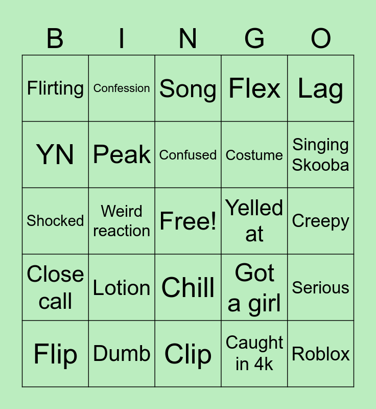 This bingo card has a free space and 29 words: Flip, Tay, Weird reaction, Baby oil, Flirting, Song, Peak, Lotion, Yelled at, Dumb, Creepy, Roblox, Clip, Caught in 4k, Singing Skooba, Reference, Chill, Close call, Lag, Shocked, Got a girl, Non funny joke, Costume, YN, Flex, Confession, Serious, Confused and Left.