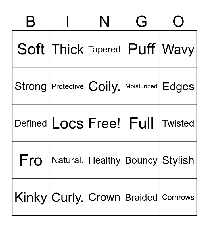 This bingo card has a free space and 24 words: Natural., Curly., Coily., Kinky, Wavy, Soft, Strong, Thick, Full, Healthy, Moisturized, Defined, Bouncy, Stylish, Protective, Braided, Twisted, Tapered, Edges, Locs, Cornrows, Fro, Puff and Crown.