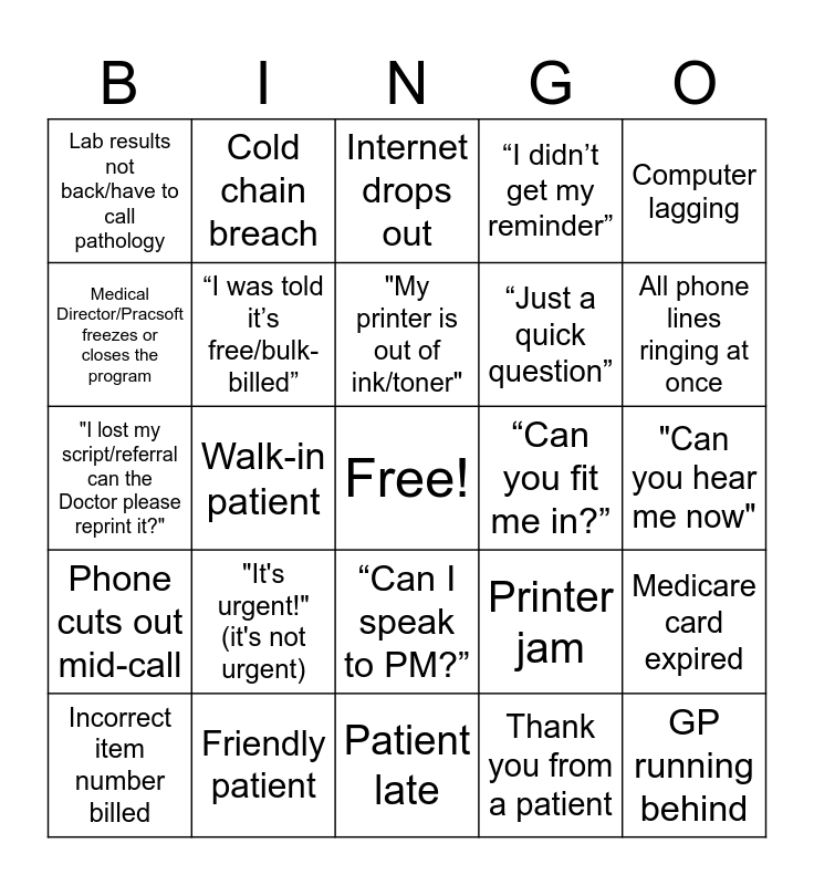 This bingo card has a free space and 24 words: "It's urgent!" (it's not urgent), Friendly patient, "My printer is out of ink/toner", Incorrect item number billed, Computer lagging, Lab results not back/have to call pathology, Medical Director/Pracsoft freezes or closes the program, Cold chain breach, “Can you fit me in?”, “Can I speak to PM?”, “Just a quick question”, "I lost my script/referral can the Doctor please reprint it?", Printer jam, Medicare card expired, “I was told it’s free/bulk-billed”, Thank you from a patient, "Can you hear me now", Internet drops out, All phone lines ringing at once, Walk-in patient, GP running behind, Phone cuts out mid-call, “I didn’t get my reminder” and Patient late.