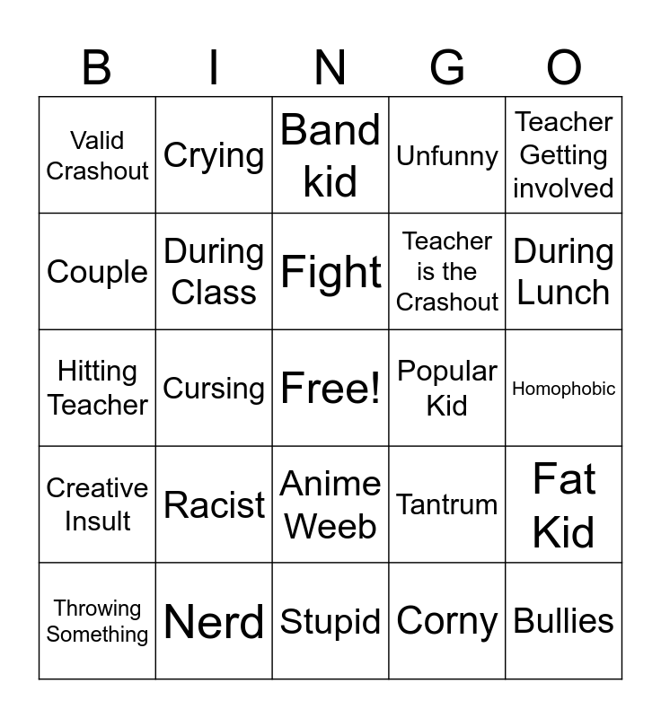 This bingo card has a free space and 24 words: Racist, Nerd, Fight, Throwing Something, Teacher Getting involved, Valid Crashout, Couple, Crying, Popular Kid, Anime Weeb, Teacher is the Crashout, Hitting Teacher, Tantrum, Fat Kid, During Class, Corny, Homophobic, Band kid, During Lunch, Cursing, Bullies, Creative Insult, Unfunny and Stupid.